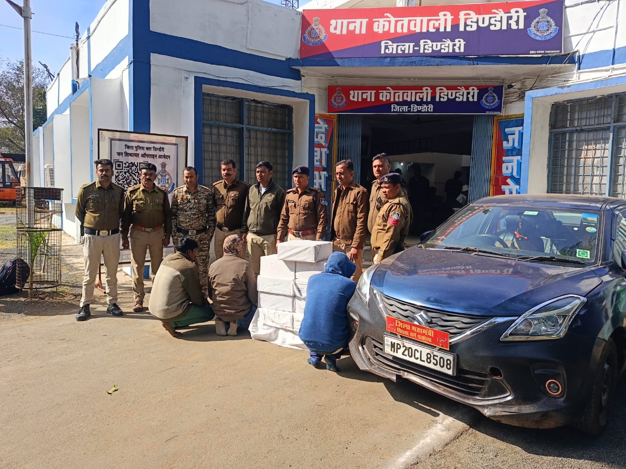 डिंडौरी। जिले में अवैध गतिविधियों पर रोक लगाने पुलिस अधीक्षक वाहनी सिंह के निर्देशन में लगातार अभियान चलाया जा रहा है। इसके तहत कोतवाली डिंडौरी पुलिस ने बीती देर रात एक बड़ी अवैध शराब तस्करी का भंडाफोड़ करते हुए तीन आरोपियों को गिरफ्तार कर भारी मात्रा में अंग्रेजी शराब और चारपहिया वाहन जप्त किया है।