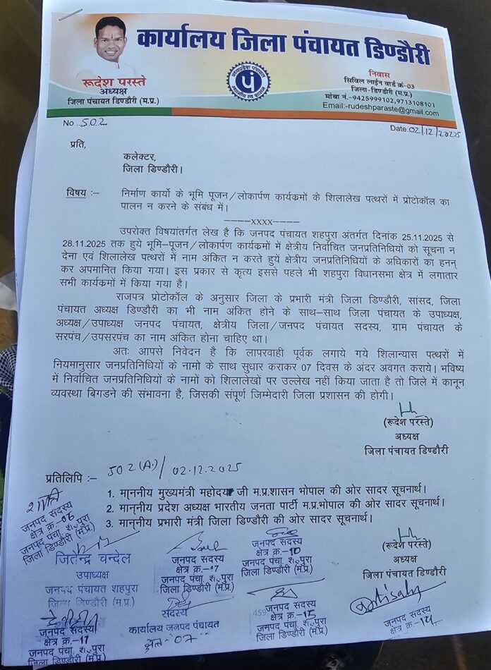 प्रतिनिधियों का कहना है कि 25 से 28 नवंबर 2025 के बीच शहपुरा जनपद क्षेत्र में आयोजित विभिन्न सरकारी कार्यक्रमों की न तो क्षेत्रीय जनप्रतिनिधियों को सूचना दी गई और न ही कार्यक्रम स्थल पर लगाए गए शिलालेख पत्थरों में प्रोटोकॉल के अनुसार उनके नाम शामिल किए गए। उन्होंने इसे जनप्रतिनिधियों के सम्मान, अधिकार और लोकतांत्रिक परंपराओं का खुला उल्लंघन बताया है।