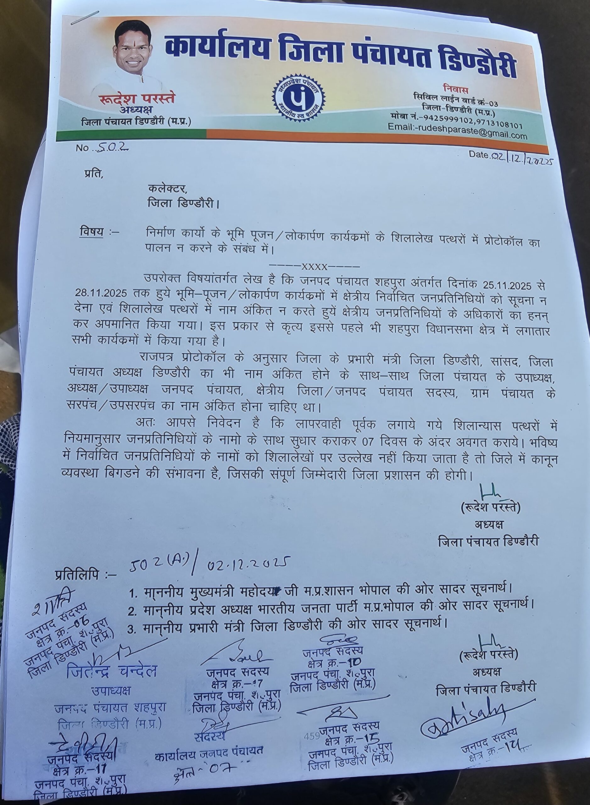 जनपद पंचायत शहपुरा क्षेत्र में आयोजित विकास कार्यों के भूमि-पूजन और लोकार्पण कार्यक्रमों में प्रोटोकॉल का पालन न किए जाने को लेकर विवाद लगातार गहराता जा रहा है। जिला पंचायत अध्यक्ष रूदेश परस्ते, जनपद पंचायत शहपुरा के उपाध्यक्ष जितेन्द्र चंदेल सहित अन्य निर्वाचित जनपद सदस्यों ने मंगलवार को कलेक्टर डिण्डौरी अंजू पवन भदौरिया से मुलाकात की और सामूहिक रूप से लिखित शिकायत सौंपी।