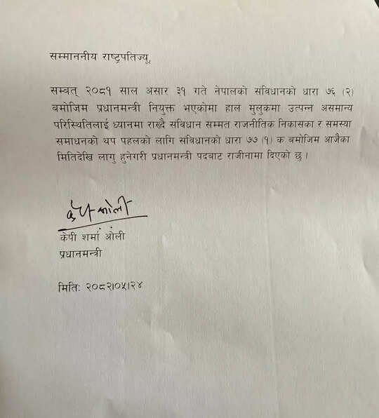 नेपाल के पीएम का इस्तीफा पत्र