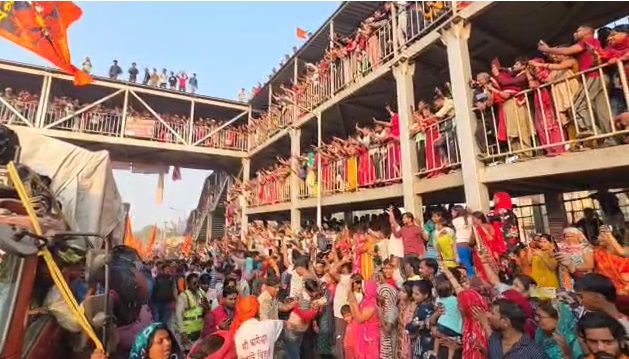 जैसे ही तीसरे दिन की यात्रा आगे बढ़ी वैसे ही कुछ दूर बाद 51 जेसीबी से सनातनियों के ऊपर पुष्प वर्षा की गई। करीब 500 मीटर तक सिर्फ जेसीबी रखी दिखाई दे रही थी। भारी भीड़ का बुलडोजर से अभूतपूर्व स्वागत किया गया। आधा घंटे से अधिक समय तक लगातार पुष्प वर्षा होती रही।