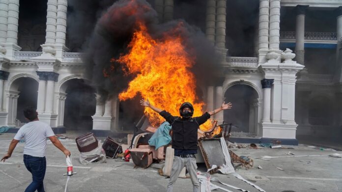 काठमांडू में मंगलवार को सोशल मीडिया पर प्रतिबंध और भ्रष्टाचार के खिलाफ प्रदर्शन के दौरान आग लगा दिए जाने के बाद नेपाल सरकार के विभिन्न मंत्रालयों और कार्यालयों के मुख्यालय सिंह दरबार में प्रदर्शनकारी जश्न मनाते हुए।