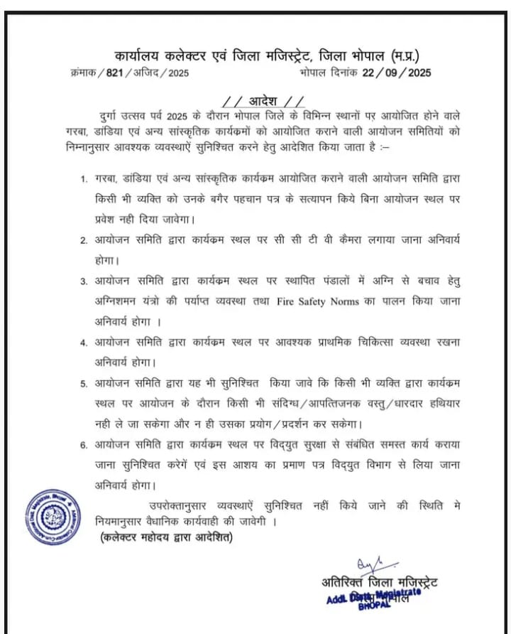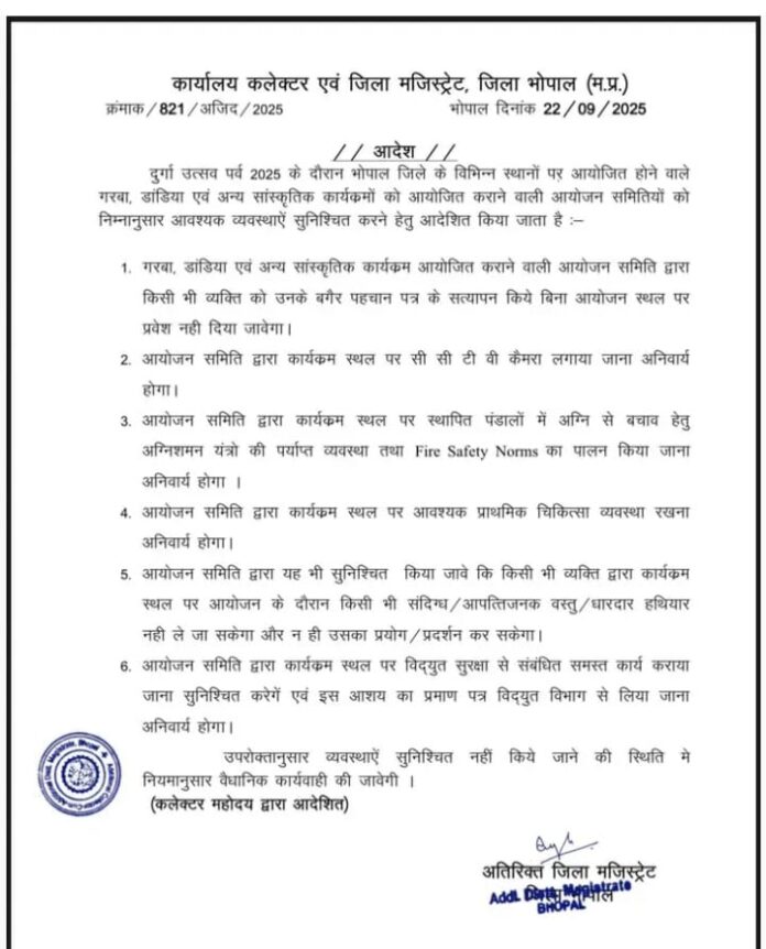 ब्यूरो रिपोर्टर सतेंद्र जैन दुर्गा उत्सव पर्व 2025 के दौरान भोपाल जिले में गरबा, डांडिया और सांस्कृतिक कार्यक्रमों के आयोजन को लेकर जिला प्रशासन ने सुरक्षा एवं व्यवस्थाओं को लेकर निर्देश जारी किए हैं। अतिरिक्त जिला मजिस्ट्रेट भोपाल द्वारा जारी आदेश में आयोजक समितियों को आवश्यक प्रबंध सुनिश्चित करने के निम्नानुसार निर्देश जारी किये हैं।