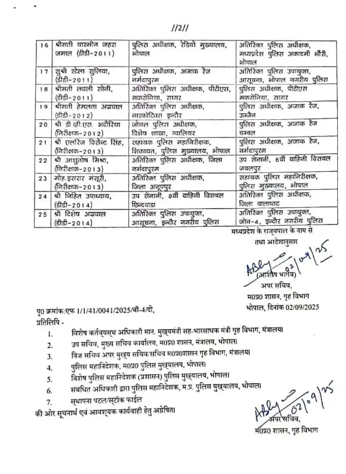 इसी तरह पुलिस मुख्यालय में सहायक पुलिस महानिरीक्षक (शिकायत) पल्लवी त्रिवेदी को पुलिस अधीक्षक भौंरी, भोपाल, बिट्टी सेहगल, उप सेनानी 13वीं वाहिनी विसबल ग्वालियर को एडिशनल एसपी खरगौन. पुलिस मुख्यालय अअवि में सहायक पुलिस महानिरीक्षक धनंजय शाह को अतिरिक्त पुलिस अधीक्षक अअवि इंदौर जोन भेजा गया है. इसी प्रकार उज्जैन जोन की अजाक एसपी मीना चौहान को अतिरिक्त पुलिस आयुक्त आसूचना इंदौर नगरीय पुलिस की जिम्मेदारी दी गई है. देखें पूरी लिस्ट…
