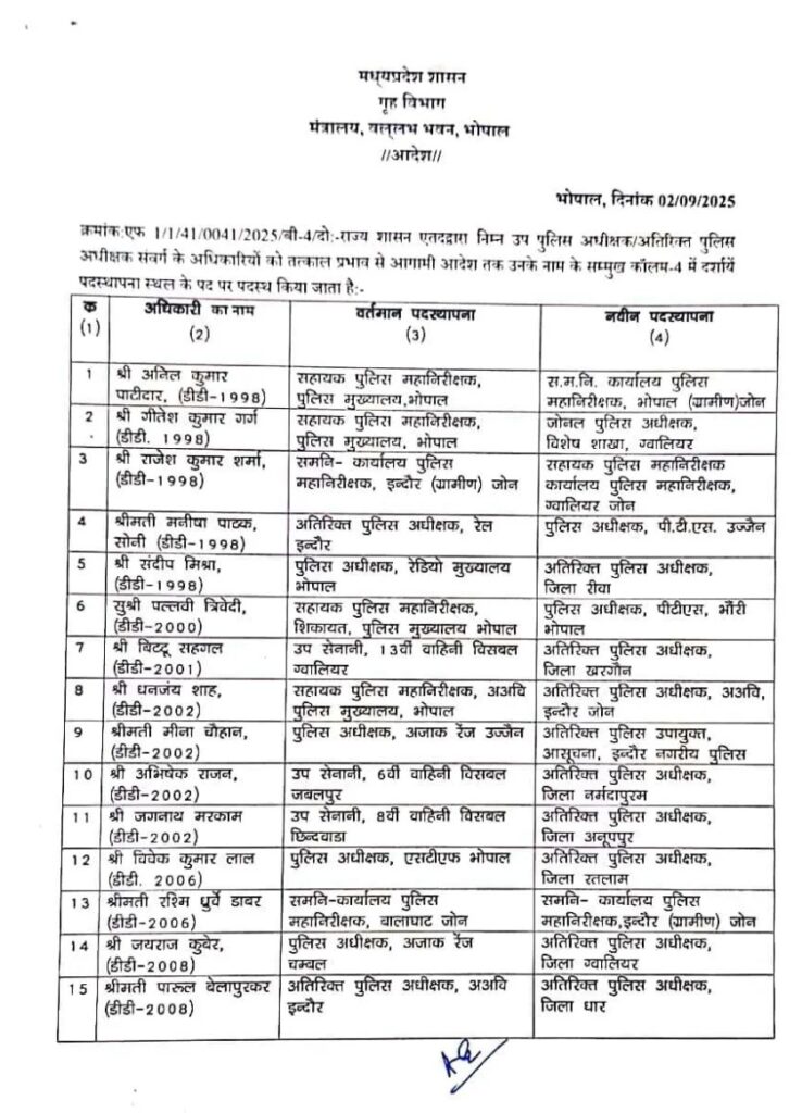 मध्य प्रदेश शासन के गृह विभाग द्वारा जारी आदेश के मुताबिक PHQ भोपाल में एआईजी अनिल कुमार पाटीदार को स.म.नि. कार्यालय पुलिस महानिरीक्षक, भोपाल (ग्रामीण) जोन, पीएचक्यू भोपाल में ही पदस्थ एआईजी गीतेश कुमार गर्ग को जोनल पुलिस अधीक्षक, विशेष शाखा, ग्वालियर, इंदौर रेल एडिशनल एसपी मनीषा पाठक को पीटीएस एसपी उज्जैन, रेडियो मुख्यालय भोपाल में एसपी संदीप मिश्रा को एडिशनल एसपी रीवा नवीन पदस्थापना दी गई है.