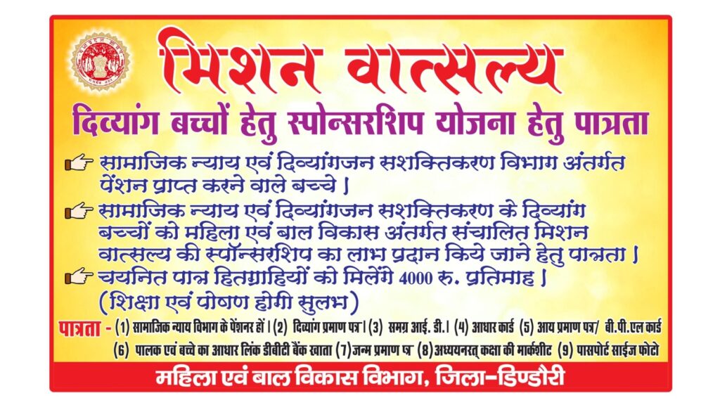 इस योजना का उद्देश्य दिव्यांग बच्चों की शिक्षा और पोषण को सुलभ बनाना है। योजना के तहत चयनित पात्र हितग्राहियों को 4000 रुपये प्रतिमाह की आर्थिक सहायता प्रदान की जाएगी।