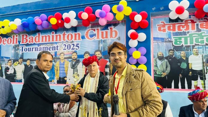 देवली बैडमिंटन क्लब द्वारा आयोजित तीन दिवसीय बैडमिंटन प्रतियोगिता का भव्य समापन समारोह के मंच पर डायरेक्टर सत्येन्द्र व्यास सहित शहर के कई गणमान्य व्यक्ति मुख्य अतिथि के रूप में उपस्थित रहे थे,,