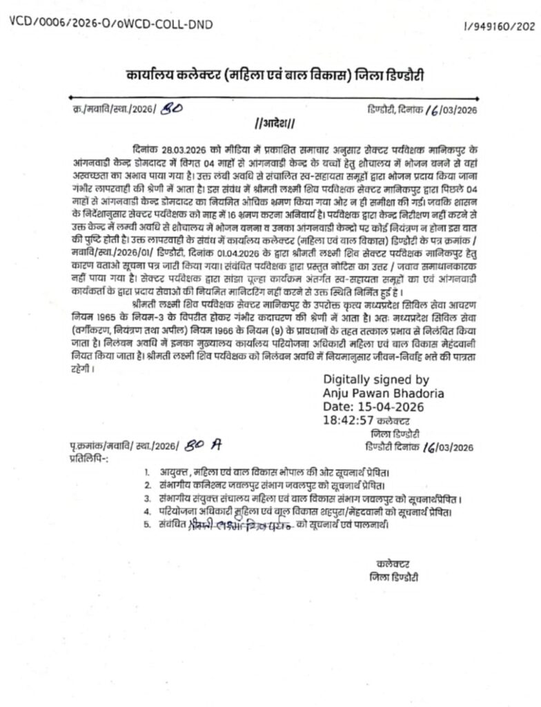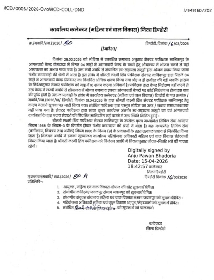 डिंडोरी जिले में आंगनवाड़ी केंद्र के निरीक्षण में लापरवाही पाए जाने पर जिला प्रशासन द्वारा सख्त कार्रवाई की गई है। कलेक्टर अंजू पवन भदौरिया के आदेशानुसार सेक्टर मानिकपुर की पर्यवेक्षक श्रीमती लक्ष्मी शिव को तत्काल प्रभाव से निलंबित कर दिया गया है। प्राप्त जानकारी के अनुसार, सेक्टर मानिकपुर अंतर्गत आंगनवाड़ी केंद्र डोमदादर में विगत चार माह से बच्चों के लिए शौचालय में भोजन तैयार किए जाने का मामला सामने आया था, जिससे स्वच्छता संबंधी गंभीर लापरवाही उजागर हुई। जांच में पाया गया कि संबंधित पर्यवेक्षक द्वारा निर्धारित निरीक्षण नहीं किया गया तथा आंगनवाड़ी केंद्रों की नियमित मॉनिटरिंग में कमी रही। शासन के निर्देशानुसार सेक्टर पर्यवेक्षक को प्रति माह निर्धारित संख्या में भ्रमण करना अनिवार्य है, जिसका पालन नहीं किया गया। इस संबंध में पूर्व में कारण बताओ सूचना पत्र जारी किया गया था, किन्तु प्रस्तुत उत्तर संतोषजनक नहीं पाए जाने पर मध्यप्रदेश सिविल सेवा (वर्गीकरण, नियंत्रण एवं अपील) नियम 1966 के तहत कार्रवाई करते हुए निलंबन आदेश जारी किया गया। निलंबन अवधि में संबंधित का मुख्यालय परियोजना अधिकारी, महिला एवं बाल विकास, मेहंदवानी कार्यालय निर्धारित किया गया है तथा उन्हें नियमानुसार जीवन-निर्वाह भत्ता देय होगा। जिला प्रशासन ने स्पष्ट किया है कि शासकीय योजनाओं के क्रियान्वयन में किसी भी प्रकार की लापरवाही बर्दाश्त नहीं की जाएगी और दोषियों के विरुद्ध सख्त कार्रवाई जारी रहेगी।